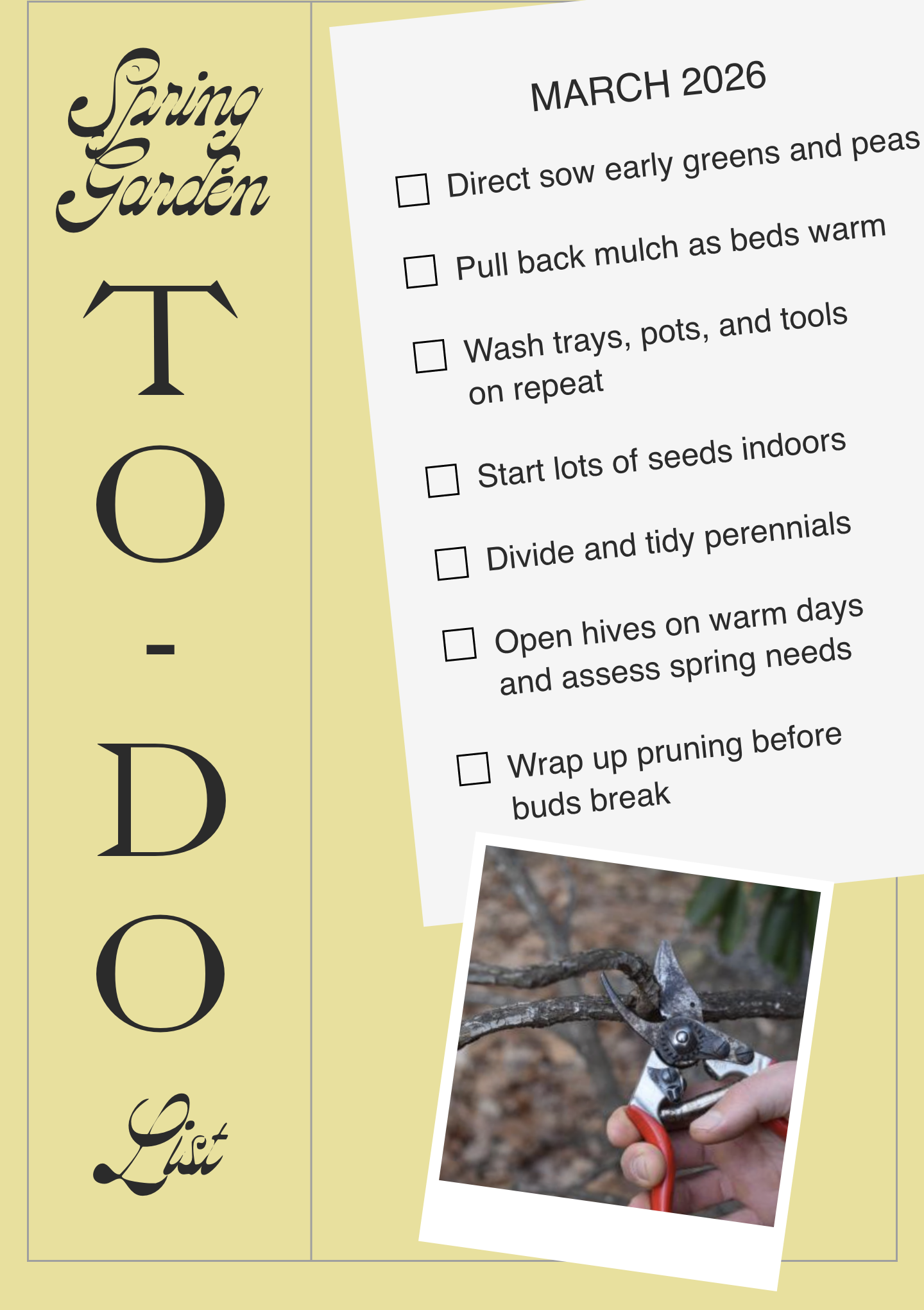 Early greens and peas go into the ground, pruning wraps up before buds break, and mulch gets pulled back as beds begin to warm. Perennials get tidied and divided, and every sunny afternoon turns into an excuse to stay outside just a little longer.